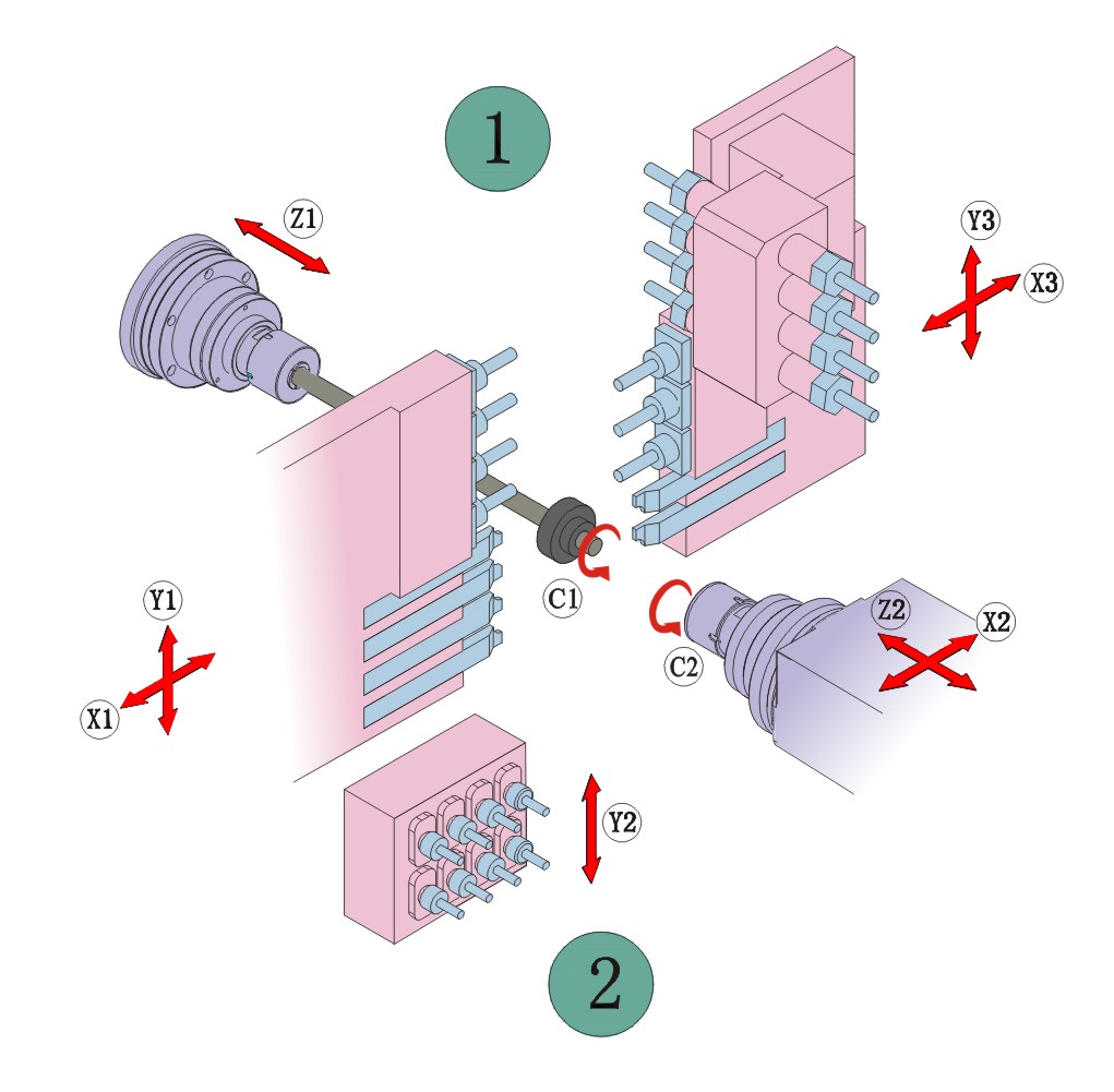8、三通道控制方式,主軸端雙X、雙Y軸控制兩把刀具同時與工件接觸,可實現兩側同時 銑面、車削、打孔工藝,大大節省了加工效率。