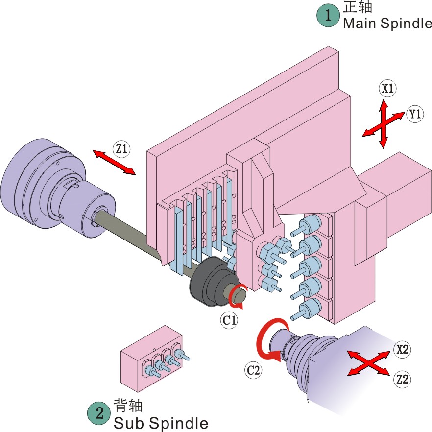 雙主軸走心機主/副軸標配C軸任意分度定位,功能齊全不套路;主軸側面動力頭5孔位/副軸4孔位支持拔插拓展功能;標配切斷檢測功能。